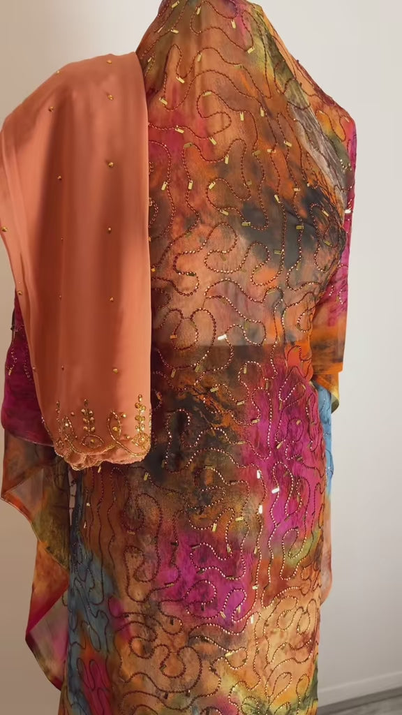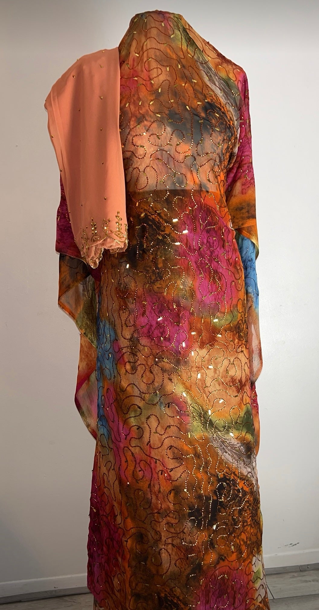 Introducing Zahra, a beautiful dirac set. This Somali Dirac set features stunning orange and pink hues, perfect for any occasion. Exude confidence and style with this elegant ensemble. Expertly crafted for a comfortable fit, elevate your wardrobe with Zahra.